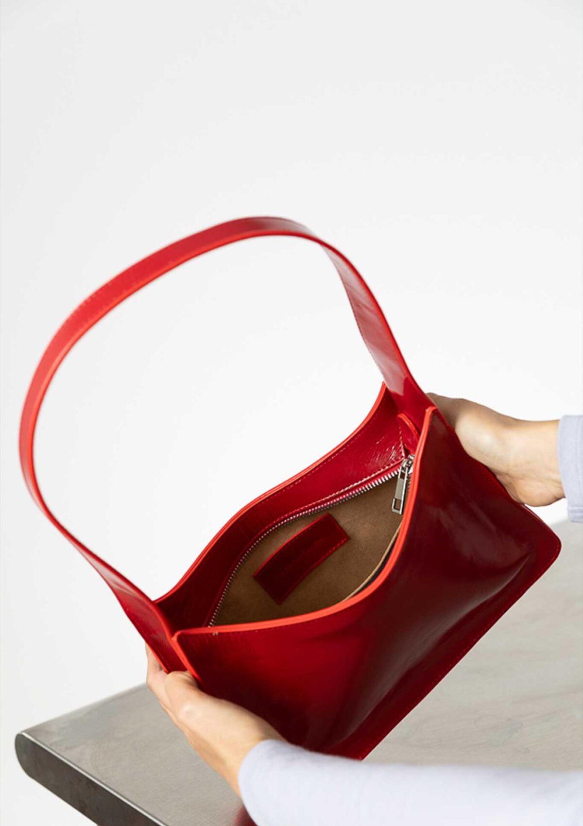 Bolso day-to-night. Piel con acabado patina en un rojo súper brillante. Forro camel, logo en bajorrelieve y cierres metálicos en níquel.